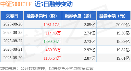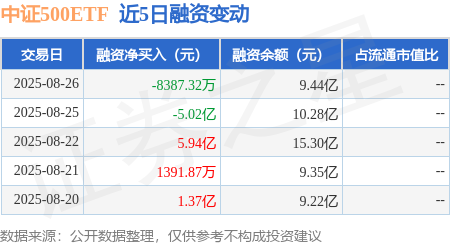本站消息,8月26日,中证500ETF(510500)融资买入1.54亿元,融资偿还2.38亿元,融资净卖出8387.32万元,融资余额9.44亿元。