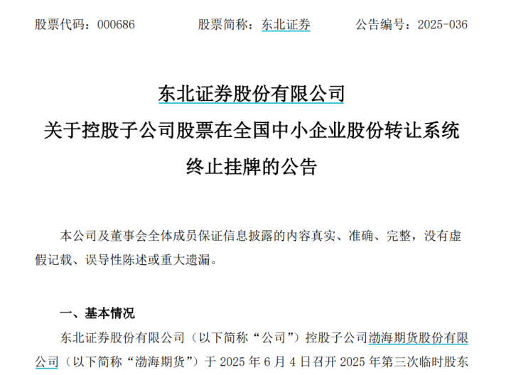 公告称,东北证券控股子公司渤海期货于2025年6月4日召开2025年第三次临时股东会议,审议通过了《关于申请公司股票在全国中小企业股份转让系统终止挂牌的议案》,渤海期货基于自身发展规划需要,拟主动申请其股票在全国中小企业股份转让系统终止挂牌。